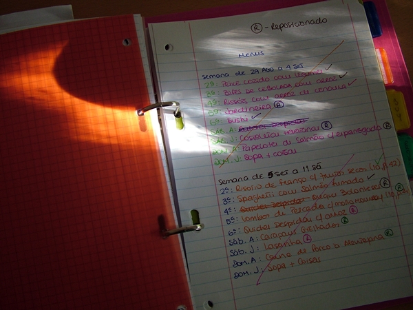 Menus: aqui organizo a nossa alimentação. Na verdade, já tenho menus preparados até ao final de Setembro... e já quase tenho a 1ª semana de Outubro resolvida. E porquê? Porque nem sempre acontece o que eu planeei e, quando assim é, reposiciono as refeições que tinha pensado. Isto poupa-me tantas, mas tantas preocupações...