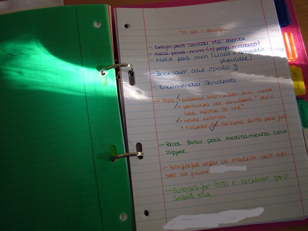 As secçõesInbox: onde vou escrevendo tudo o que me lembro e que não posso, no momento, compartimentar melhor. Depois, quando actualizo a agenda, risco coisas, tiro folhas e começo de novo.