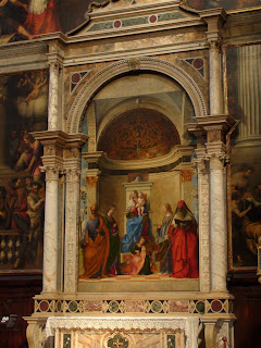 Veneza:Se há coisa de que gosto é de ver ao vivo sítios sobre os quais leio nos livros que me vão passando pelas mãos. O "The Confessor", que entretanto comecei a ler, passa-se em Roma, no Vaticano, em Munique e em Veneza. E começa com um restaurador de arte a trabalhar no restauro de um fresco de Bellini, na Igreja de San Zacharia. Ora o dito fresco é este que está na foto. Sim, desviei-me do caminho planeado para ir ver, ao vivo e a cores, o fresco. E também me desviei para passar pelo Ghetto Nuovo e pelo Ghetto Vecchio, os antigos bairros de judeus de Veneza. E amei...
